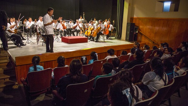Sobre el escenario, el compositor y maestro Teófilo Álvarez – director encargado de la Orquesta Sinfónica de Trujillo y todo su elenco. Álvarez empieza a explicar detalle a detalle cada uno de los instrumentos que conforman una orquesta sinfónica, detalló las características de los materiales que se utilizan para confeccionar los instrumentos, en qué tipo de música se usan e incluso apeló a la imaginación de los niños con los sonidos de violín, viola, violonchelo, así como otros instrumentos de viento y metales.