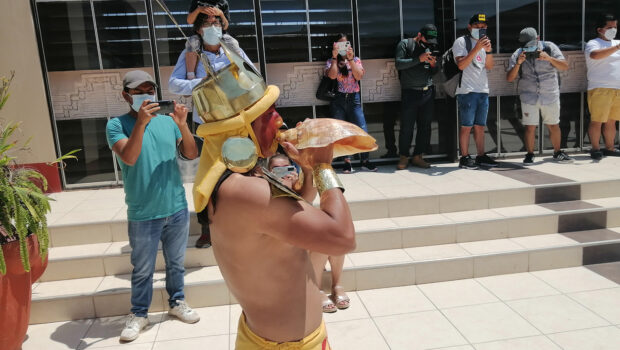 La representación se inició con un personaje Chimú, quien tocó el pututo para dar la bienvenida a los visitantes al Museo de Sitio de Chan Chan. Este mítico personaje, vestido a la usanza, también estuvo acompañado por dos guerreros y una sacerdotisa Chimú, quien era la encargada de limpiar el espacio sagrado con polvos.