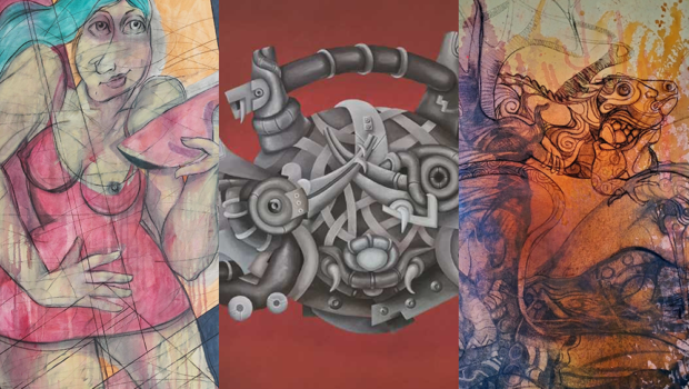 Castillo, Zavaleta y Parimango, exhiben su singular visión del arte en “Triangulación Equidistante”, una muestra cargada de una atmósfera de inquietud, que se plasma en la transfiguración de formas y cuerpos con un toque de colores arremolinados.