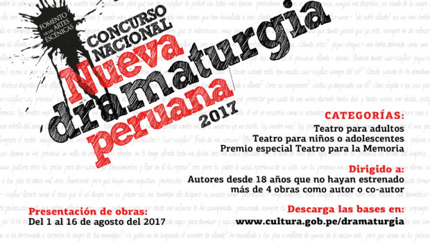Con la finalidad de generar nuevas y mejores oportunidades para los profesionales del sector de las artes escénicas, así como acercar la diversidad de expresiones de las artes escénicas a nuevos públicos, el Ministerio de Cultura lanza la cuarta versión del Concurso Nacional Nueva Dramaturgia Peruana 2017.