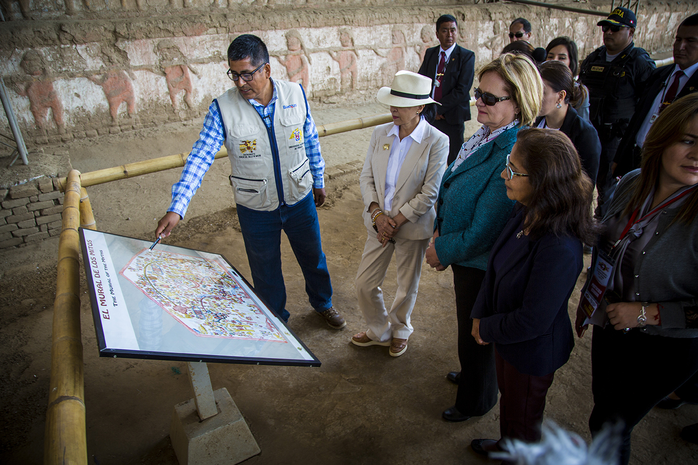 Por su parte, la primera dama de Perú, Nancy Lange de Kuczynski, destacó los trabajos de conservación e investigación que se realizan en huaca de La Luna, “este proyecto es muy importante para nuestras generaciones y gracias al señor [arqueólogo] Tello por su trabajo”.