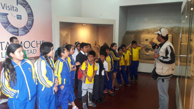 Durante el recorrido por las 6 salas remozadas, los pequeños alumnos aprecian cada uno de los elementos que integran este espacio que representa la memoria de nuestros ancestros. El guía es uno de los arqueólogos del Proyecto Especial Complejo Arqueológico Chan Chan quien ameniza su discurso con bromas y datos históricos.