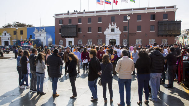 Ordenados y en columnas de uno salieron los trabajadores de la Dirección Desconcentrada de Cultura de La Libertad, para ponerse a buen recaudo, tras el sismo de gran magnitud que se registró esta tarde en Trujillo.