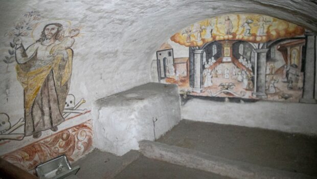 La cripta, descubierta en el año 1990, se encuentra decorada con pintura mural fragmentada, realizadas con la técnica al temple. En la parte inferior, a modo de zócalo, tiene representación de follaje roleos y volutas.